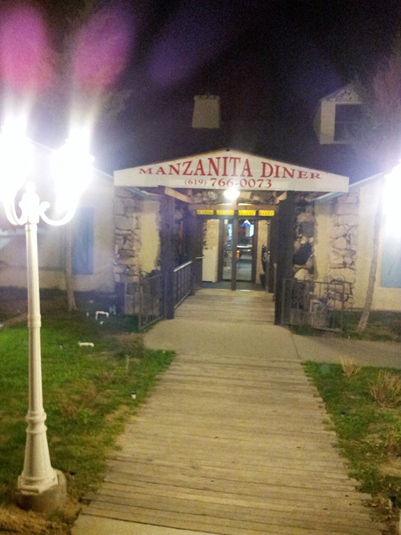 Well, I’m way behind in my posting so more will come quickly after this.  I neglected to say that between Yuma and San Diego,  I happened upon a jolly little restaurant that has very good food.  Its called the Manzanita Diner.  You can’t see it from Interstate 8.  So get off at the Campo (94) exit and go south to old highway 80 and turn left.  Its about a mile down on the left and you won’t miss it.  Boulevard’s population is 315 so its hard to get lost there.